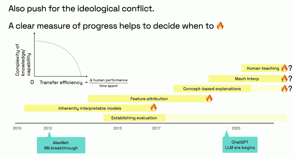 In Kim’s talk, the major idea she was building towards was the idea of the Pareto frontier of interpretability. Her goal is still about extracting AI insight for human understanding, as in what she has previously called neology or what David Bau would call the empowerment view. The purpose is to be able to transfer some superhuman knowledge from the AI to the human, with the two axes of the Pareto frontier being the “complexity of the transferred knowledge” and the “transfer efficiency”, which is defined as the improvement in human performance (seemingly a proxy for knowledge learned) per time taken. It seems the choice to put ‘transfer speed’ rather than the (inverse) ‘time taken’ is to emphasize the practical utility for a single user, rather than emphasizing its use as a tool for scientific discovery for human kind. She writes more about this in a blog post here.